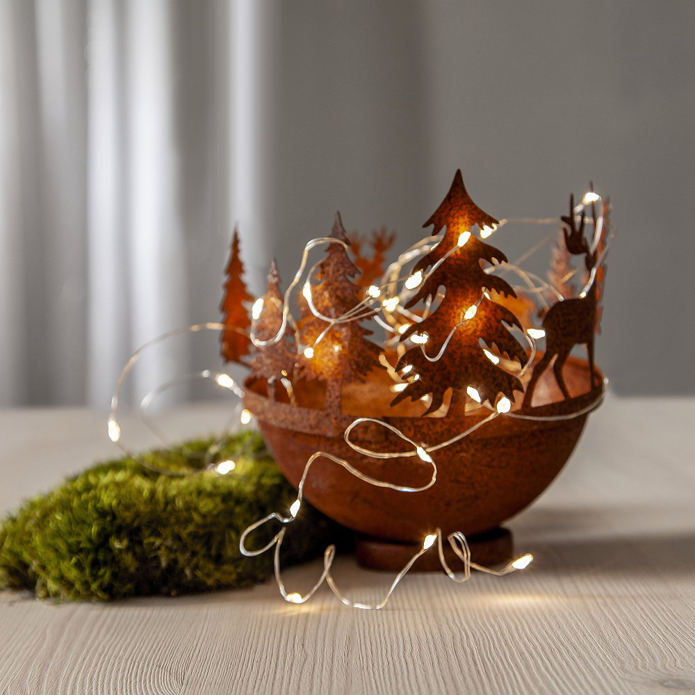 Batteridriven ljusslinga med 40 stycken LED dew drops. Slingan är silverfärgad med varmvitt ljussken.