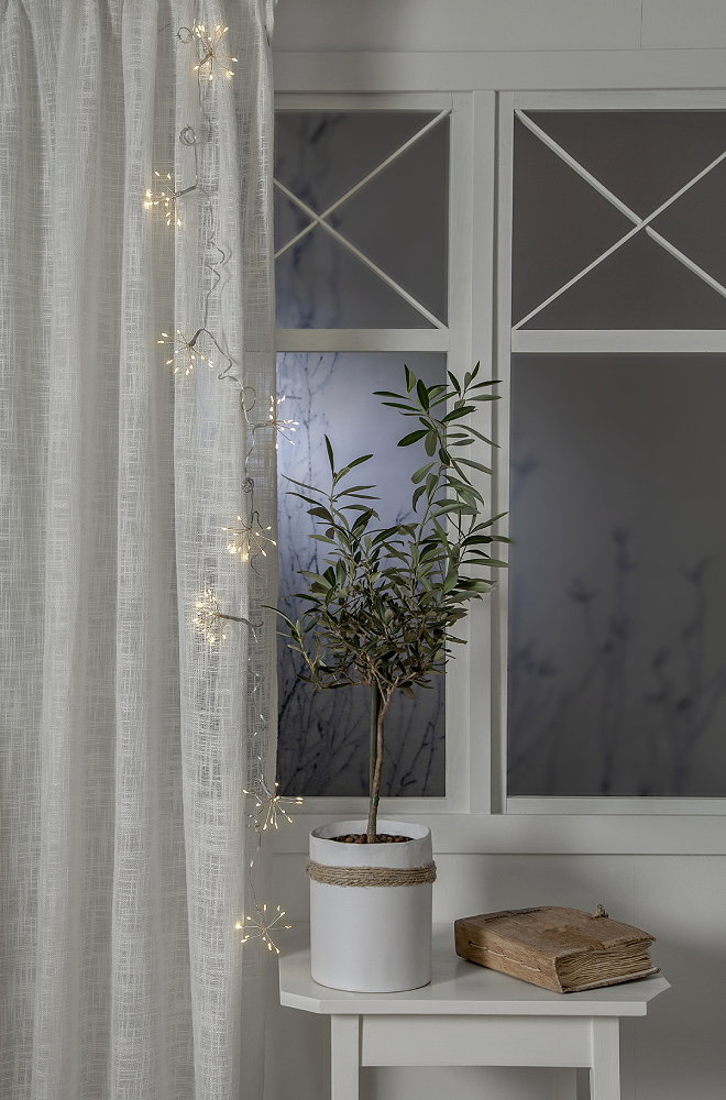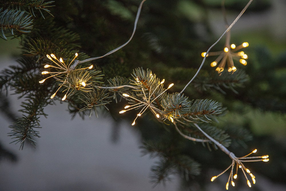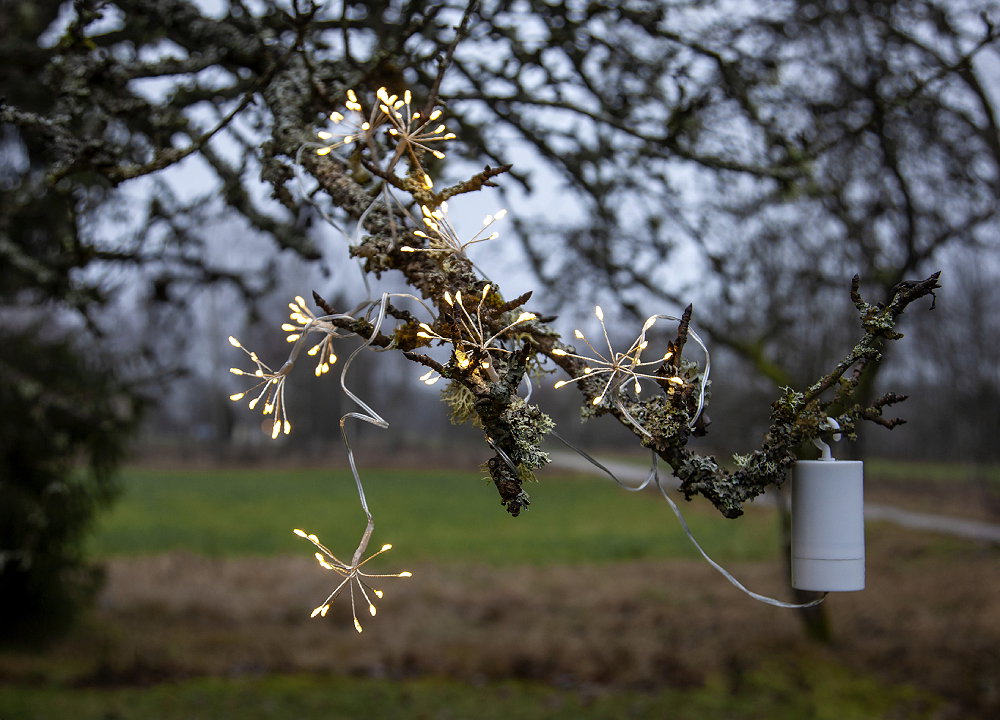 Batteriboxen är gjord för att klara utomhusbruk. Slingan är transparent och ljusen kallvita med timerfunktion.