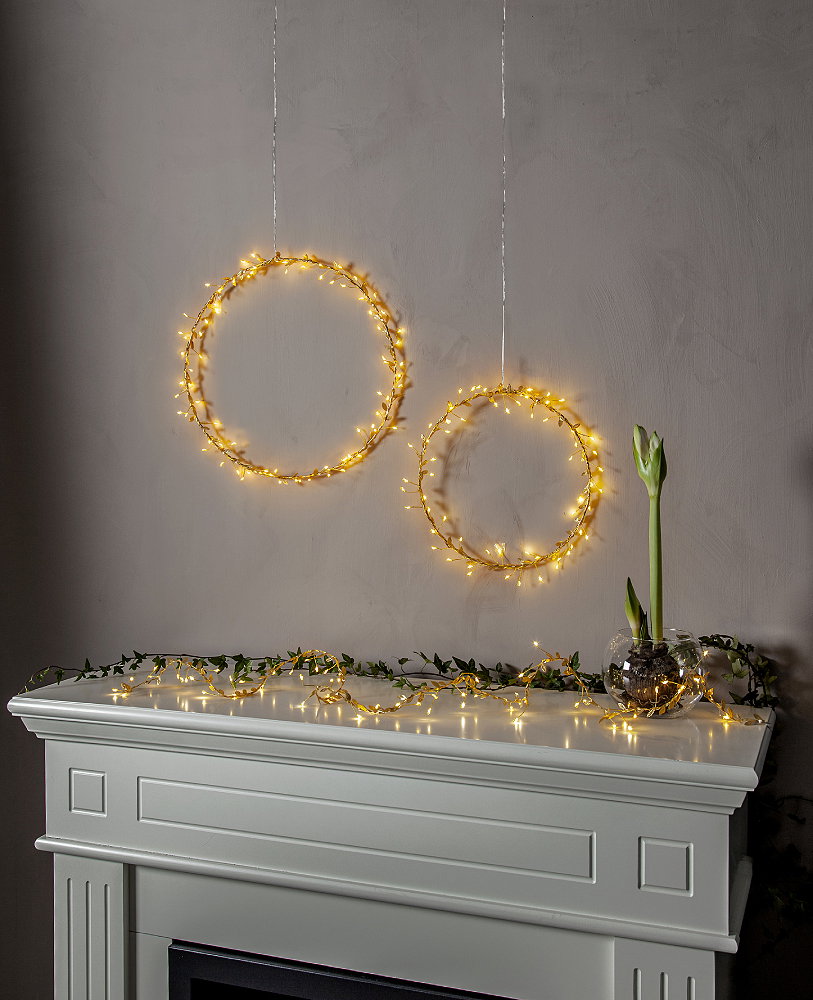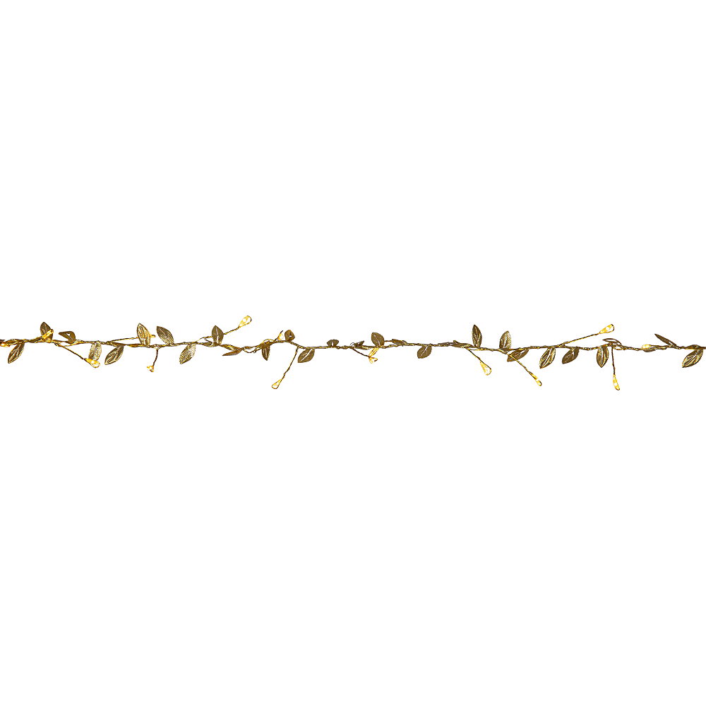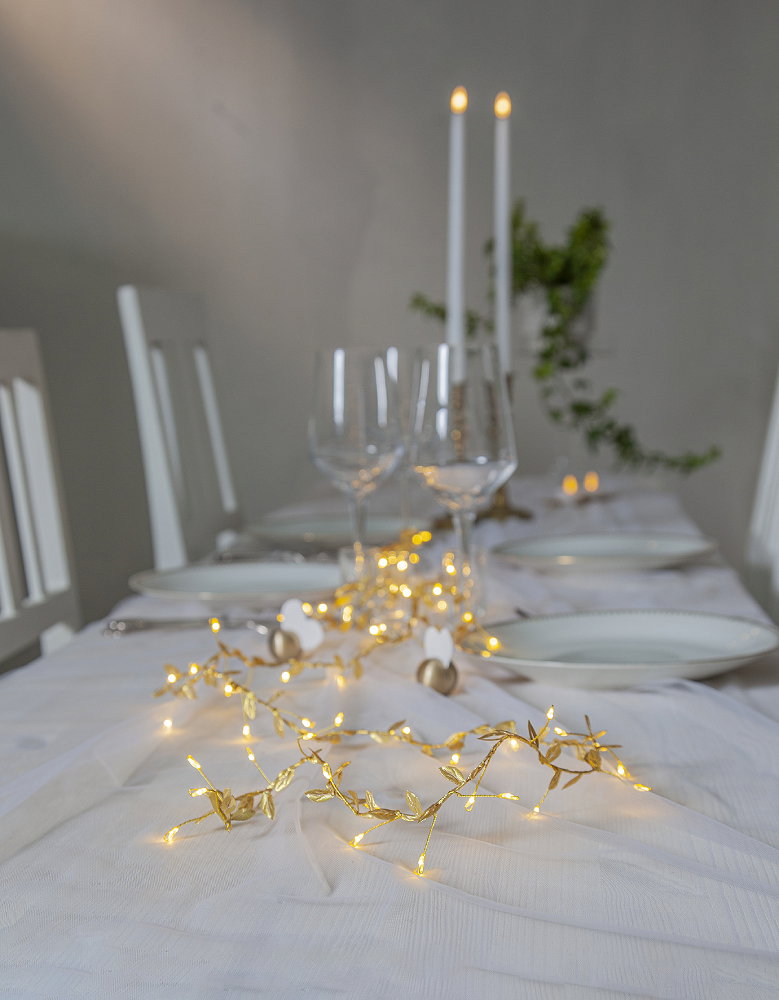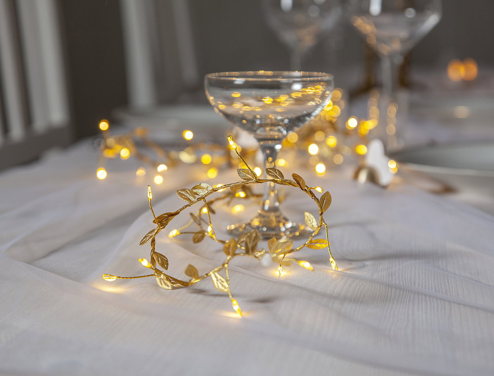 Tunn mässingsfärgad ljusslinga med 60 ljuspunkter och guldfärgade polyesterlöv. En vacker dekoration för hemmet, perfekt för t.ex. dukning.