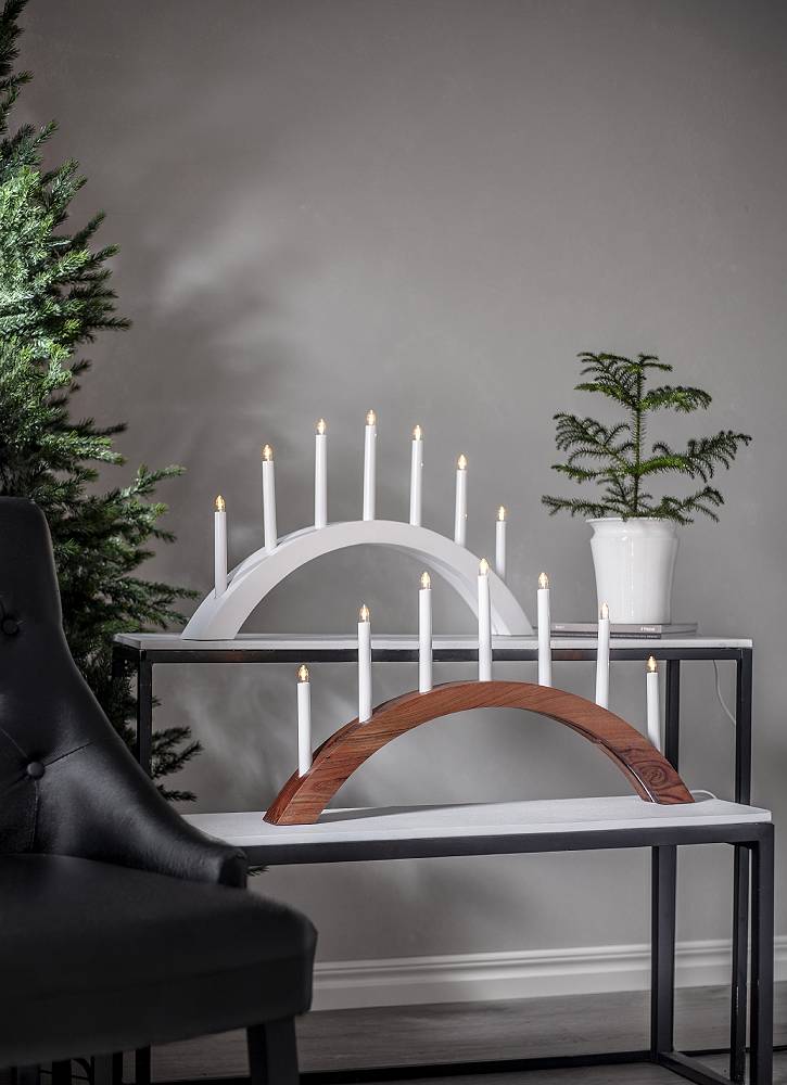 Stilren vit bågformad adventsljusstake tillverkad i trä. Med LED lampor.