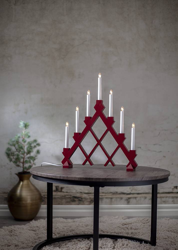 Röd Adventsljusstake i trä med 7 armar för 230V.