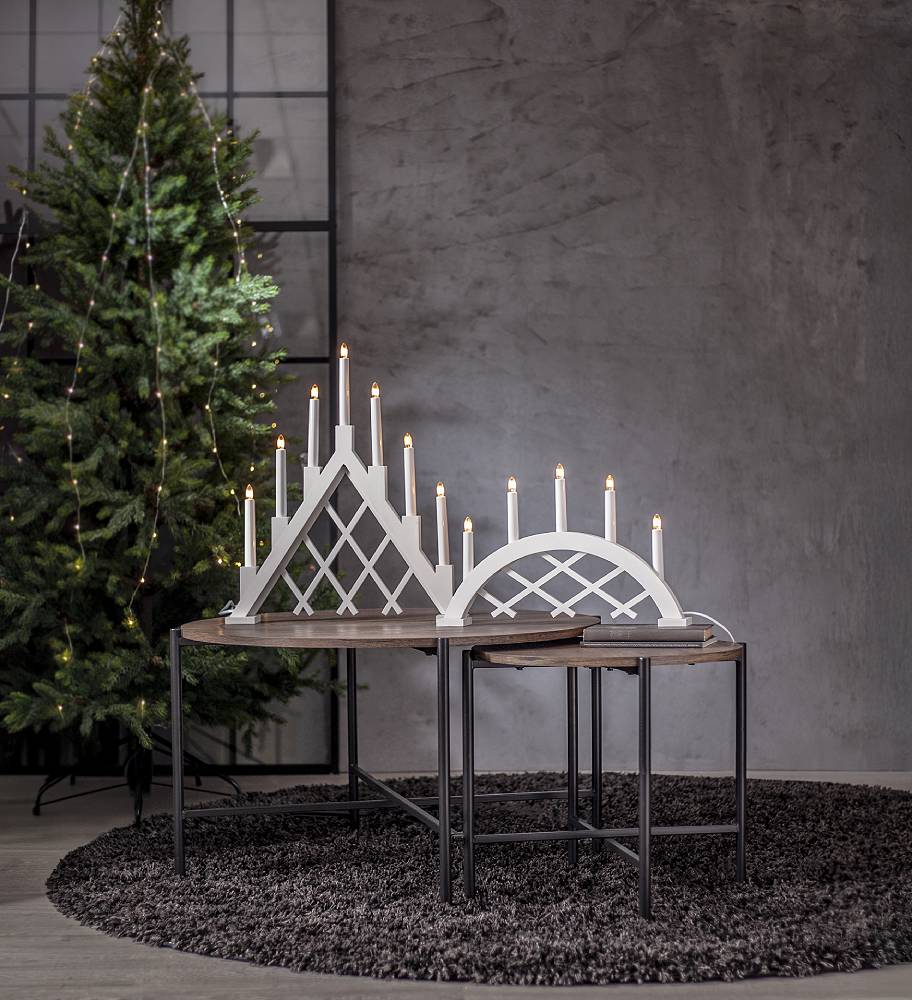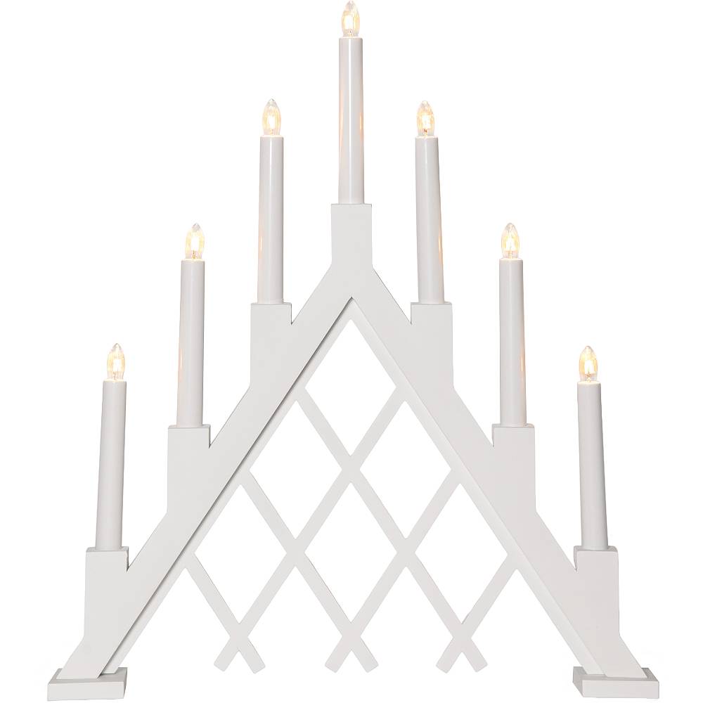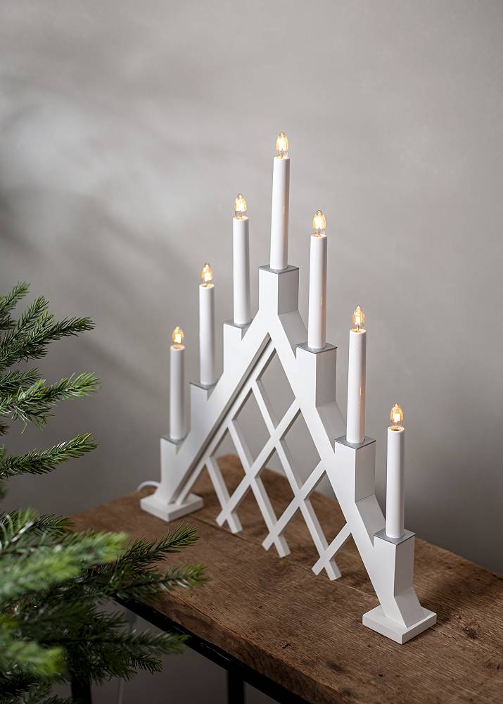 Vit adventsljusstake med fint rutmönster. Stilren design som håller från år till år.