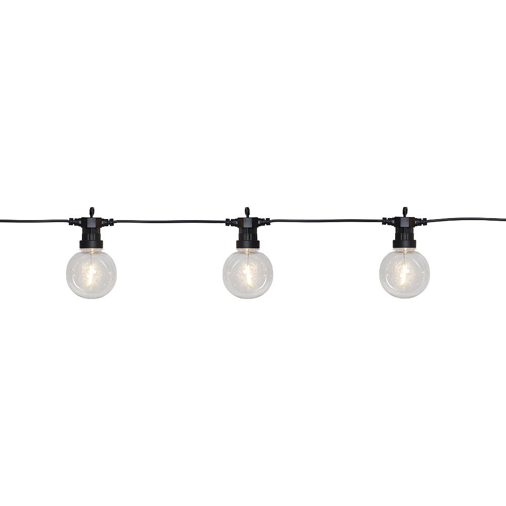 Partyljusslinga med transparenta höljen och 10 LED-ljuskällor med filament.