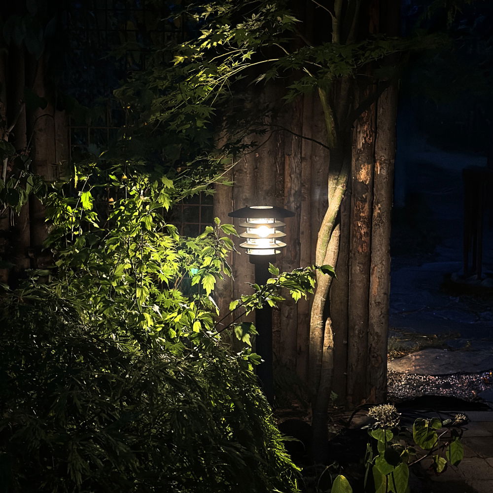 Dessutom fungerar den som ett fint komplement i växtlighet där du inte önskar använda markspotar, utan där du vill få ljus högre upp och skapa ett allmänt belyst område. Då snön täcker marken vintertid kan lägre lampor ha en tendens att "försvinna".