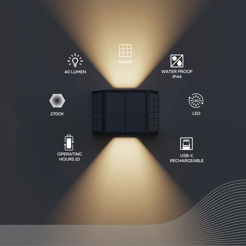 Fungerar med solenergi och kan laddas via USB-C. - Uppåt- och nedåtriktad belysning: Justerbar ljusstråle (115° uppåt, 35° nedåt).
