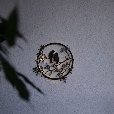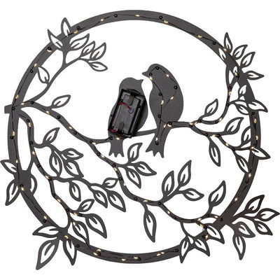 Soldriven dekoration för väggmontering av metall. Modellen är gjord som en siluett med fåglar och grenar, vilket blir en vacker dekoration både dagtid och i mörkret när den lyser upp med varmvita dew-drops som är lindad på baksidan.