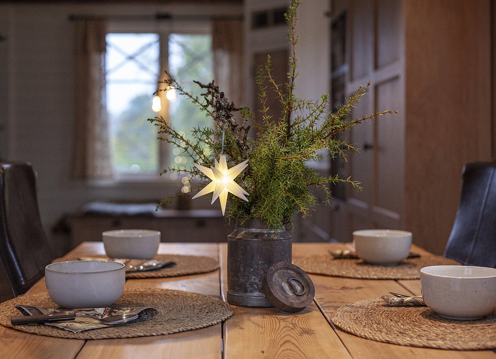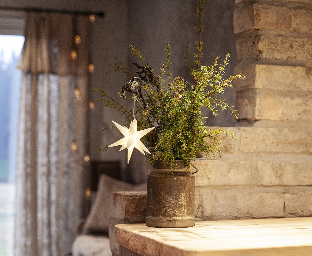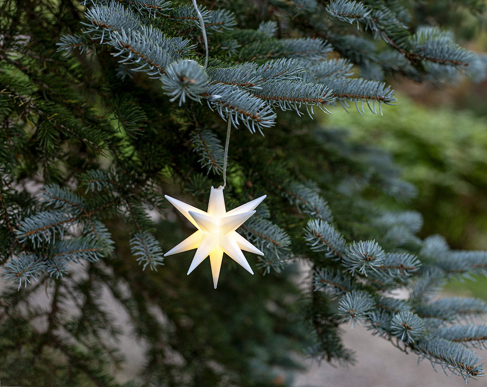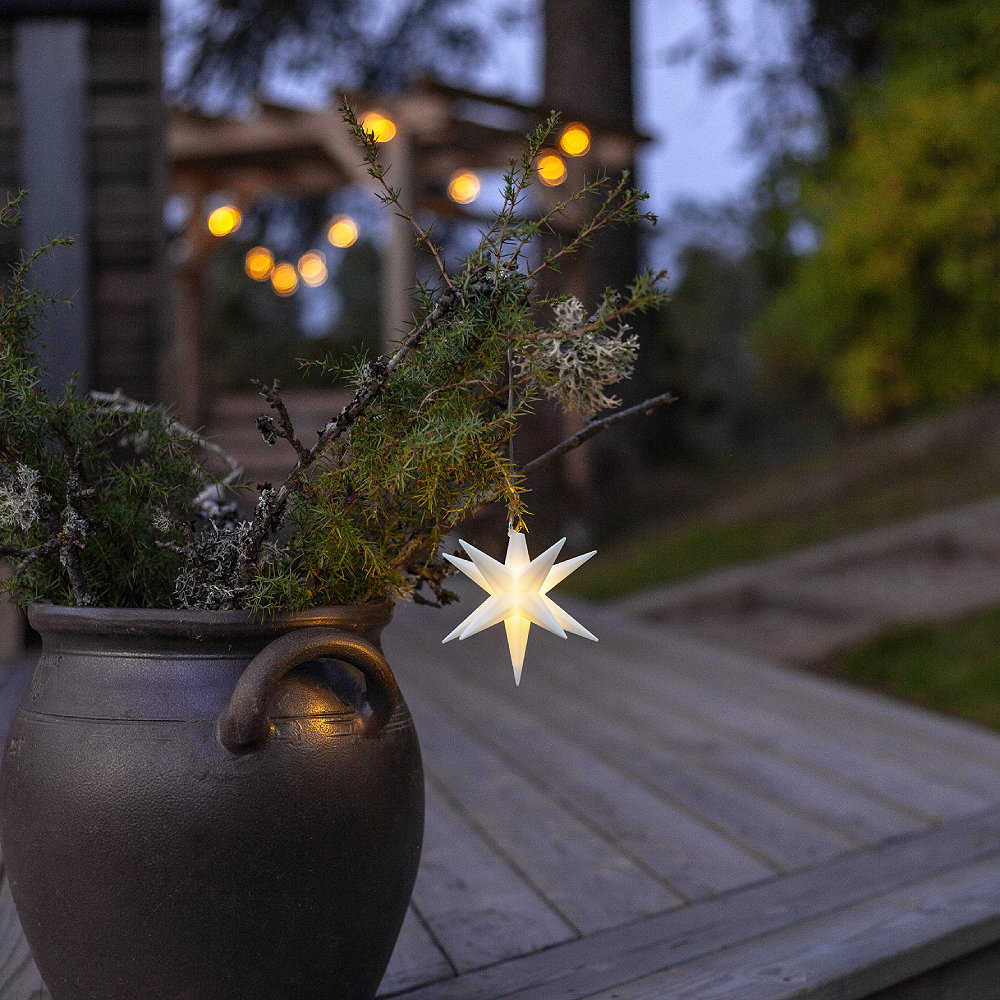 Batteridriven tredimensionell stjärna för utomhusbruk. Lyser med varmvitt sken från den inkluderande LED lampan. Lyser stämningsfullt i trädgården och ger en härlig jul och vinterkänsla både inne och ute.