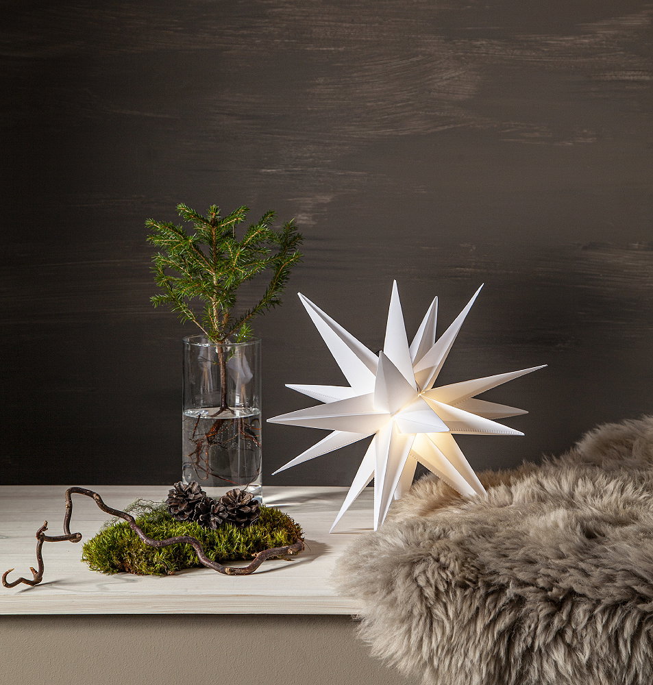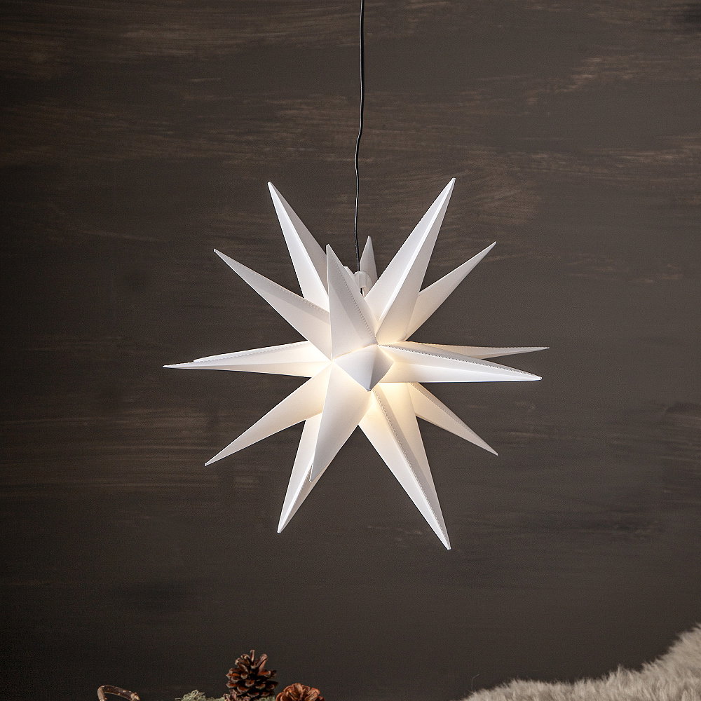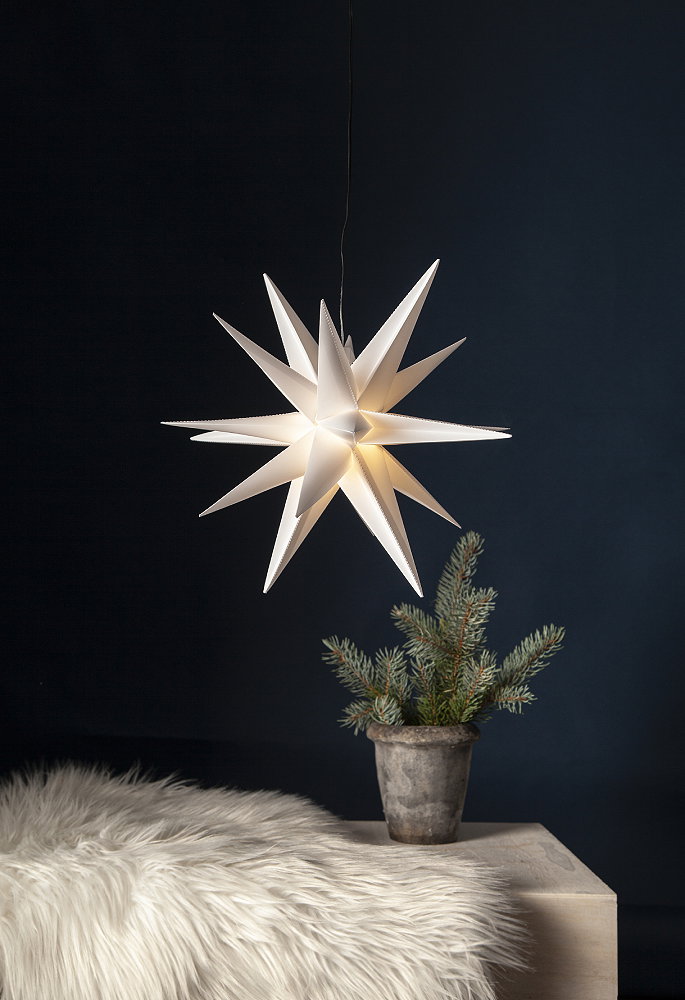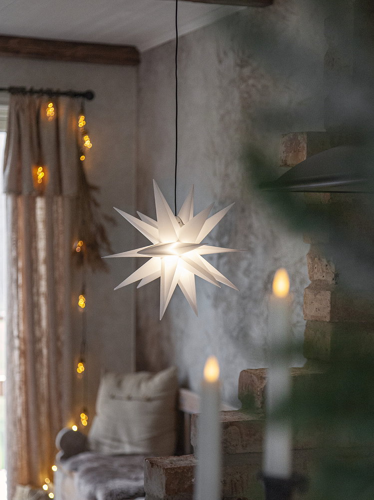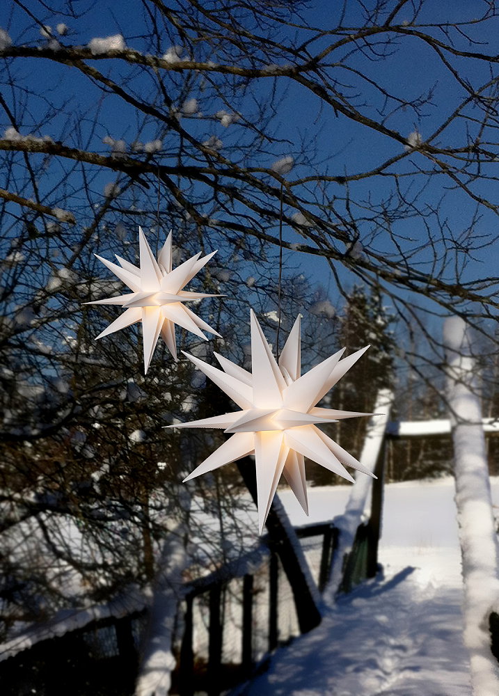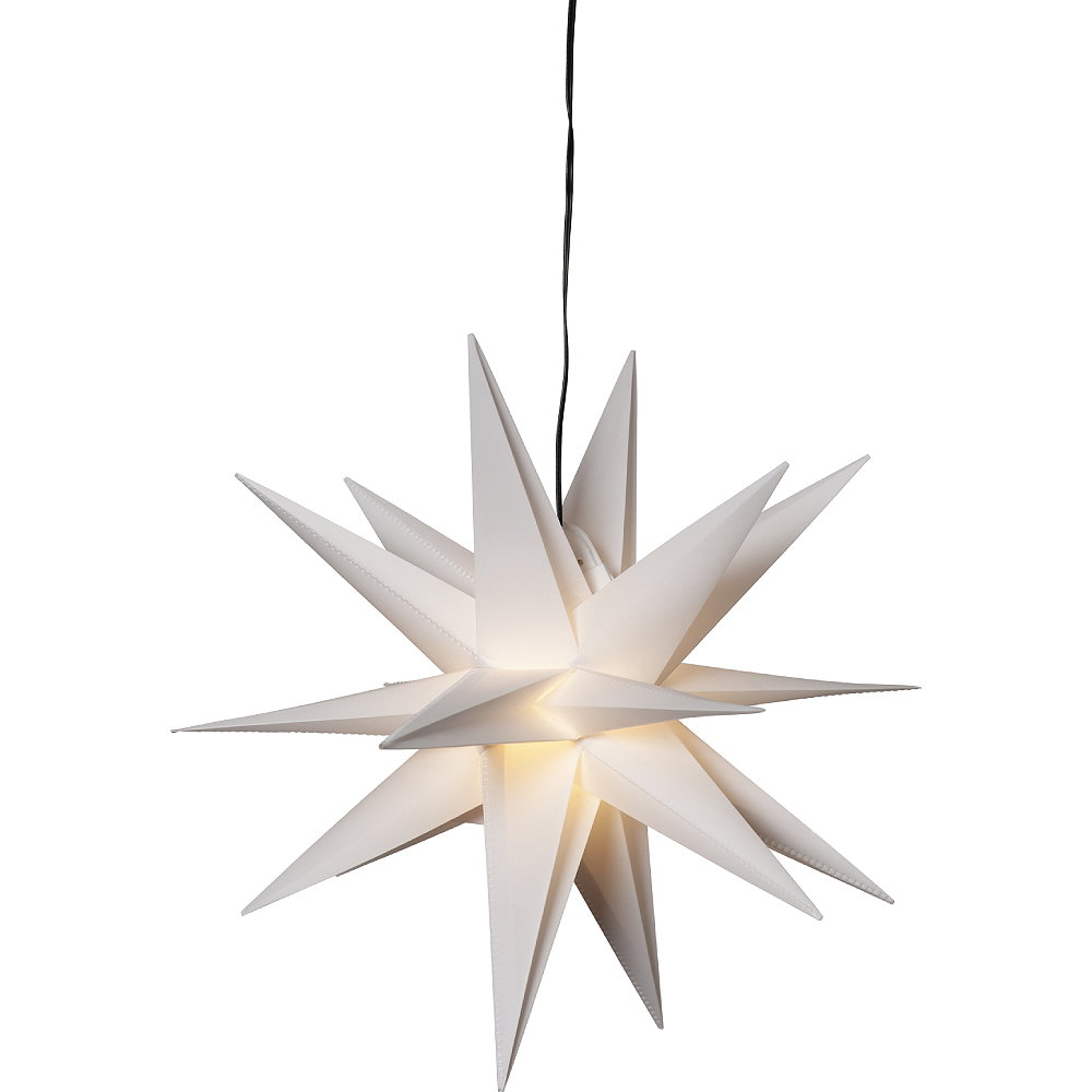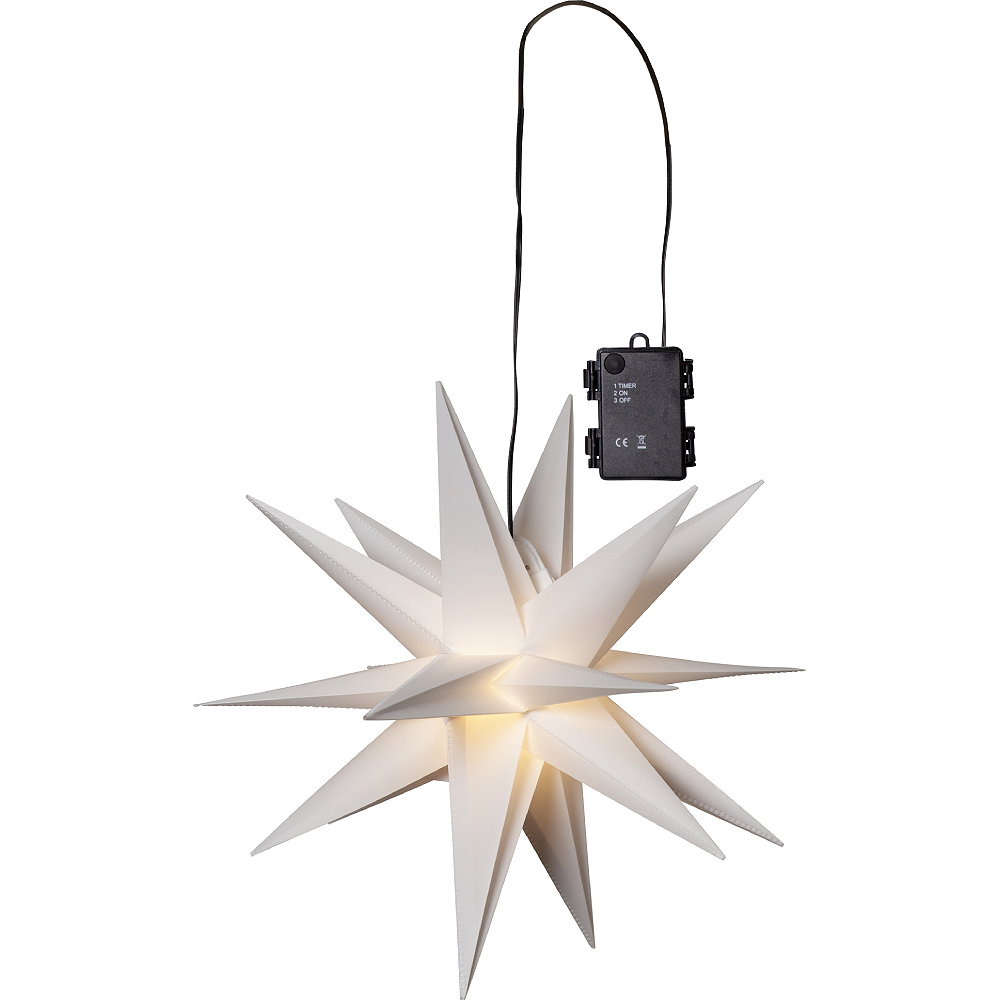 Batteridriven tredimensionell stjärna för utomhusbruk. Lyser med varmvitt sken (LED-lampa ingår). Lyser upp din balkong, trädgård eller uterum med mera och sprider en härlig vinterkänsla.