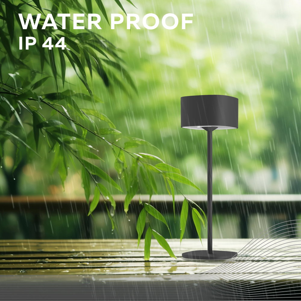 Med sin IP44-certifiering är denna lampa motståndskraftig mot fukt och regn, vilket gör den säker att använda på terrasser, balkonger eller under campingturer. Det robusta höljet och den högkvalitativa finishen säkerställer lång livslängd.