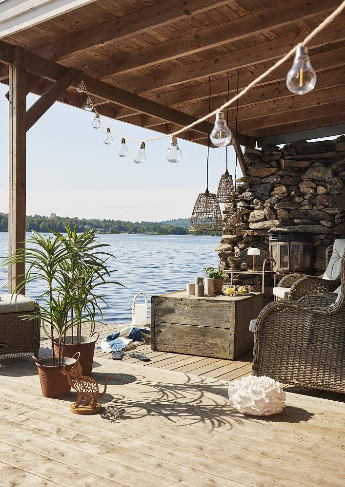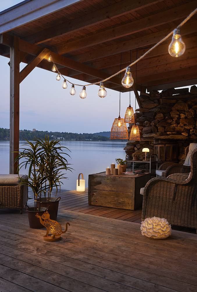 Den lyser med varmvitt sken och är fin att placera i din trädgård eller på en balkong. Batteriboxen är placerad undertill och har ett extra lock som skydd för att kunna placeras utomhus.