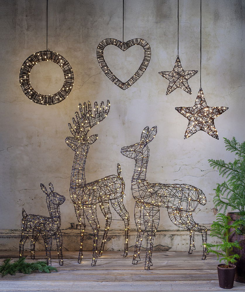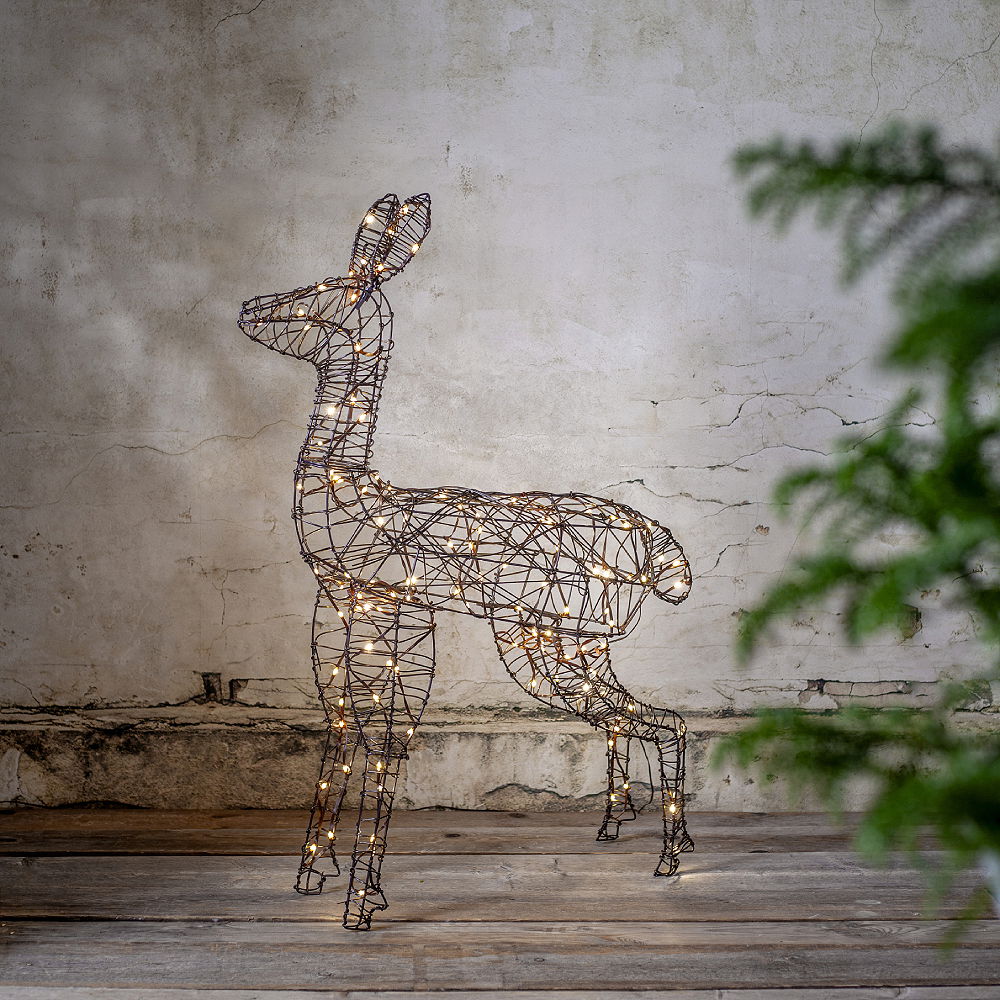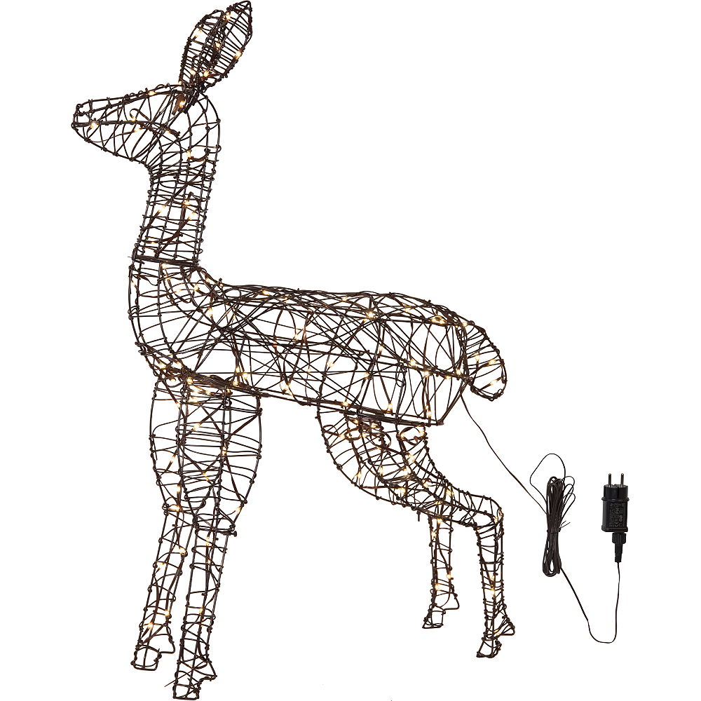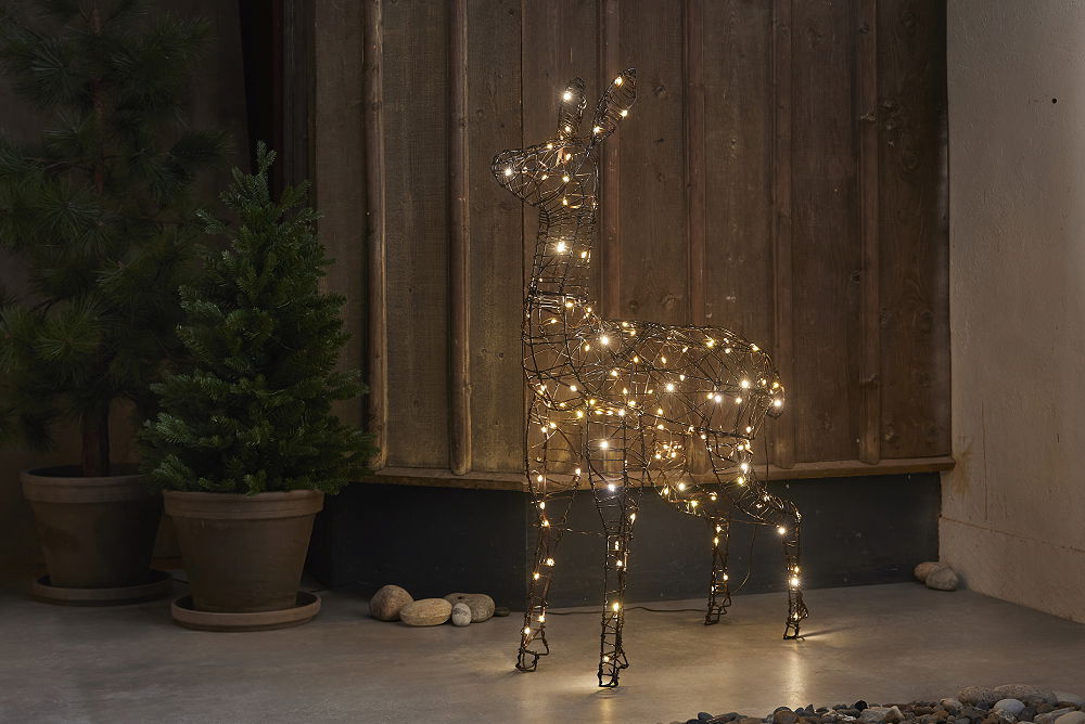 Stämningsfull dekoration för din trädgård eller uteplats. 100 cm hög brun ren med 120 varmvita LED ljuspunkter. Metallstomme med brun konstrotting.