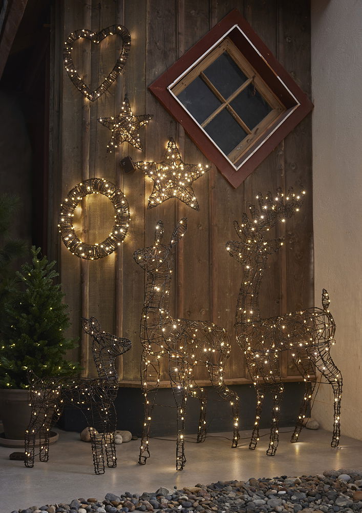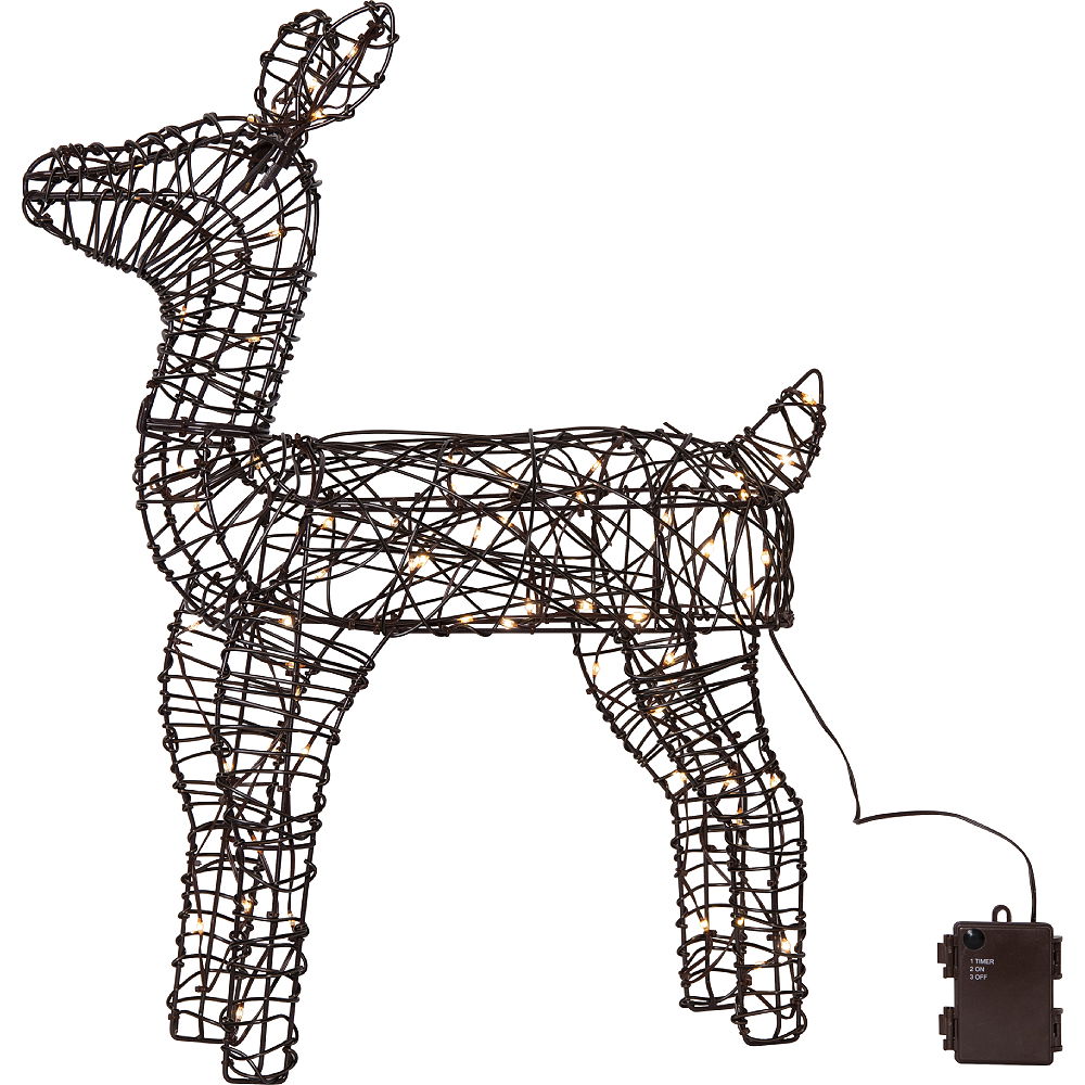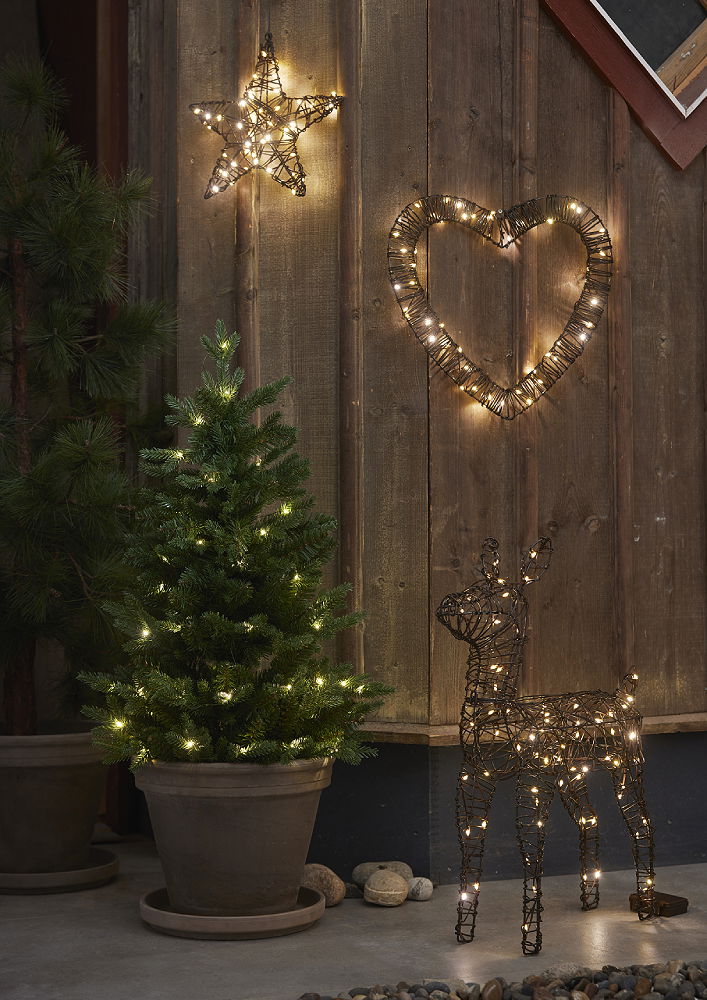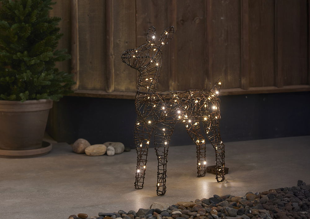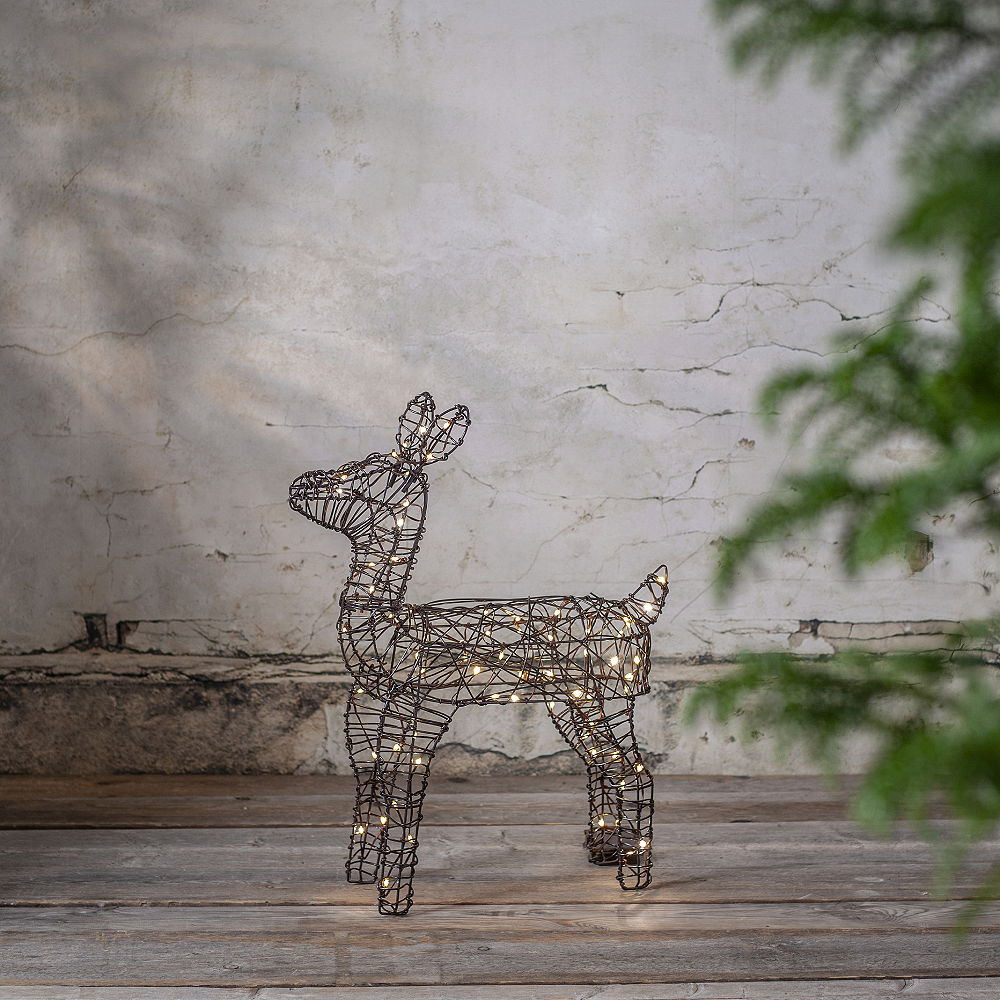 Stämningsfull dekoration för din trädgård eller uteplats. 58 cm hög brun ren med 70 varmvita LED ljuspunkter. Metallstomme med brun konstrotting.