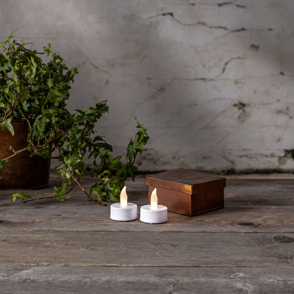 2-pack vita värmeljus med mycket naturtrogen låga som lyser med varmvitt sken.